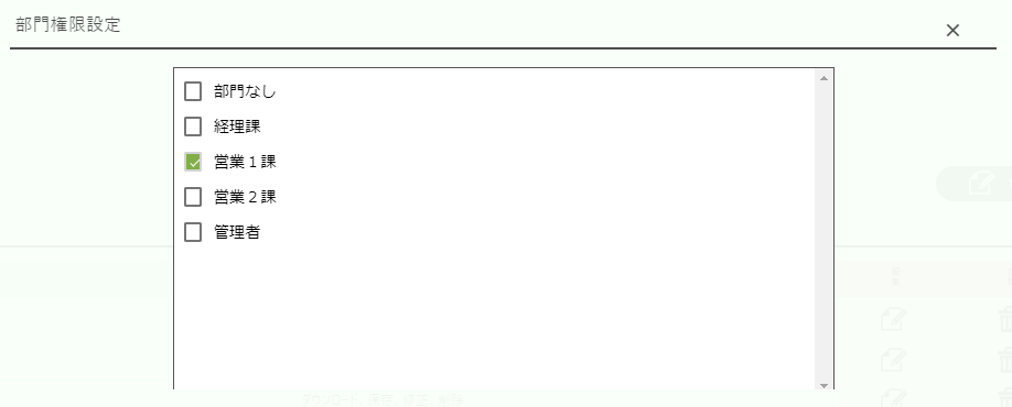 チェックが入っている場合、その部門で登録したファイルを参照できます。逆にチェックが入っていない場合は参照できません。(※ 所属部門とその下に属する部門はチェックを外せません。)