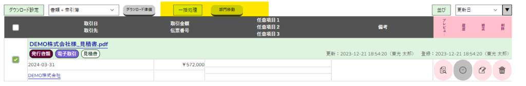 今まで登録した書類に部門を登録する場合、書類一覧の「一括処理:部門移動」から部門を一括で登録することができます。
