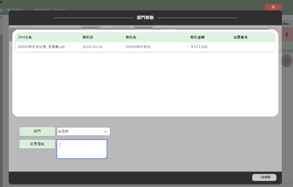 一覧で部門を設定したいデータにチェックをした状態で、「部門移動」ボタンをクリックすると、登録画面が開きます。この状態で部門を設定すると一括で登録することができます。
