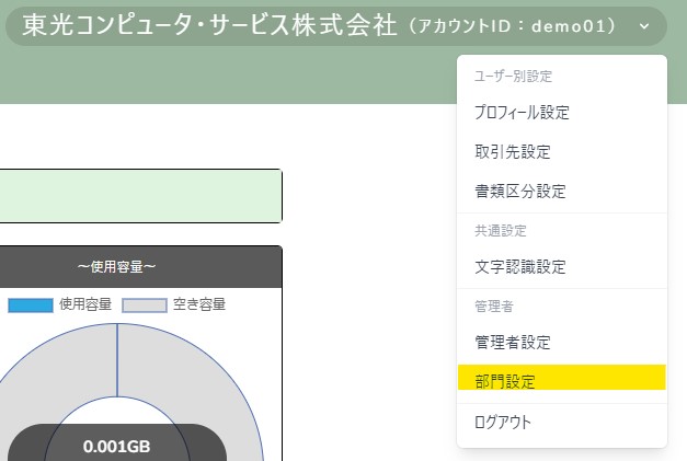 管理者権限のユーザーでログインしている場合、「部門設定」メニューが追加されます。