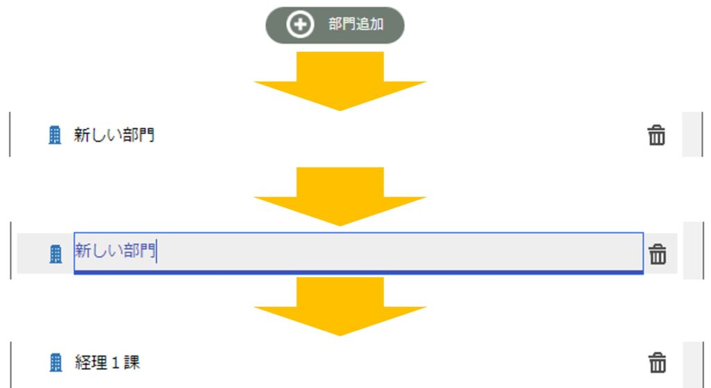部門追加ボタンをクリックすると「新しい部門」が一覧内に作成されます。ダブルクリックすることで、名前を変更できます。