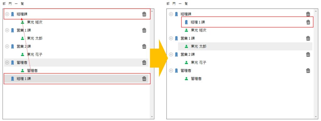 部門、またはユーザーをドラッグ&ドロップすると、ドロップ先の部門の下に配置できます。